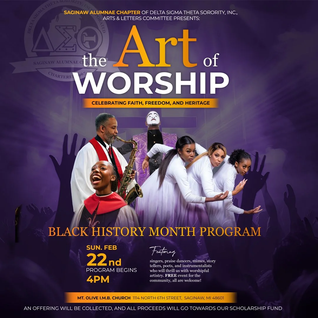 Join us for "The Art of Worship: Celebrating Faith, Freedom, and Heritage", an inspiring Black History Month program hosted by the Arts & Letters Committee of the Saginaw Alumnae Chapter of Delta Sigma Theta Sorority, Incorporated. This event celebrates the richness of African American culture and spirituality through various forms of artistic worship, including song, dance, mime, poetry, spoken word, and instrumental performances.